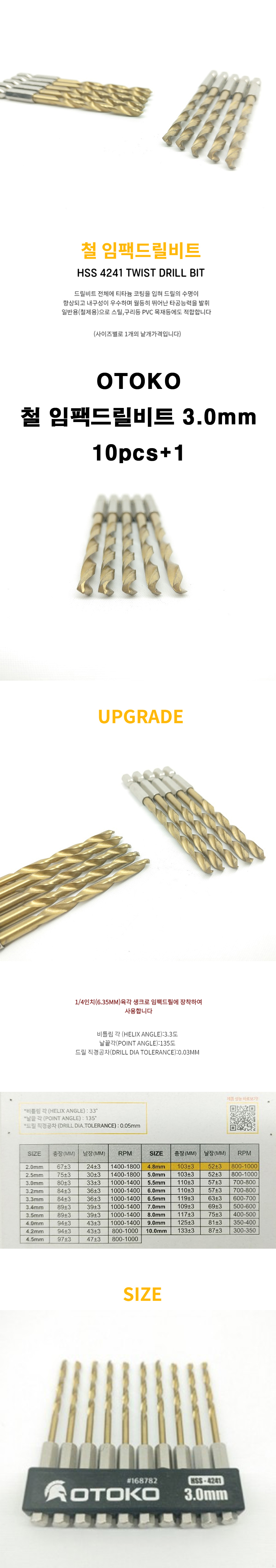 철판기리 타공 티타늄코팅 HSS 4241 철임팩드릴비트 3.0MM 10pcs+1