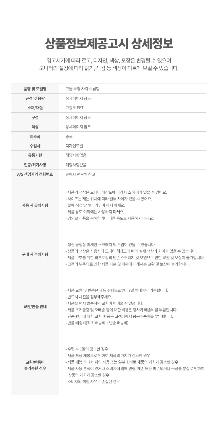 | 제조자(사) | 상세정보 별도표기 | A/S 책임자 또는 소비자 상담 관련 전화번호 | 판매자 연락처 확인 |