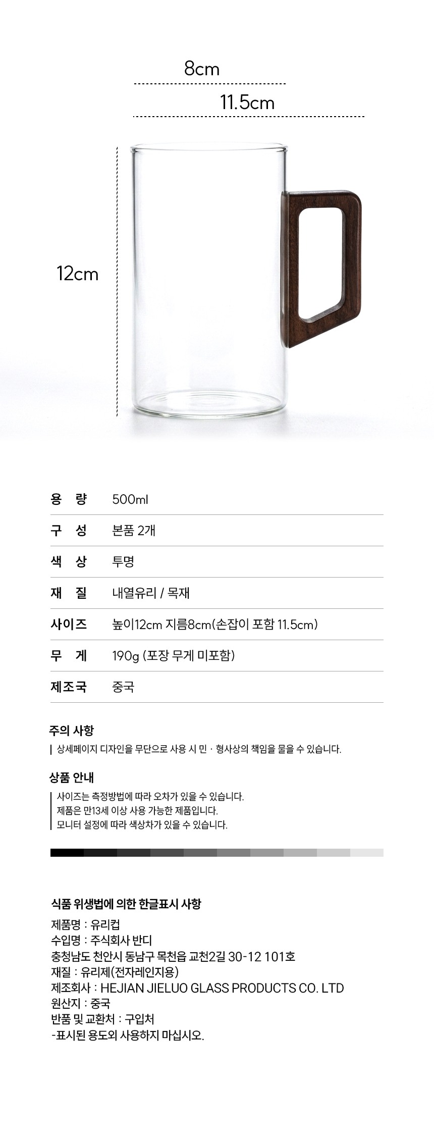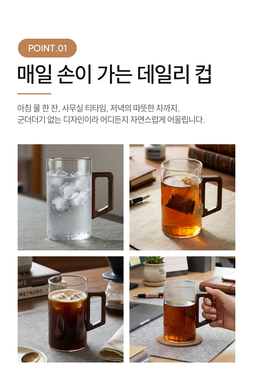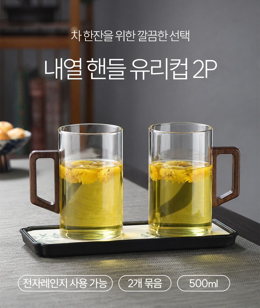우드 핸들 예쁜 심플 내열 유리컵 머그컵 2p 500ml