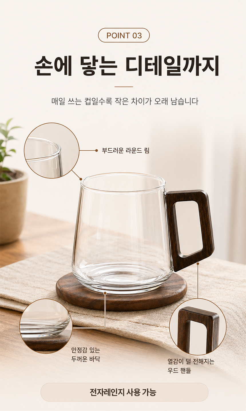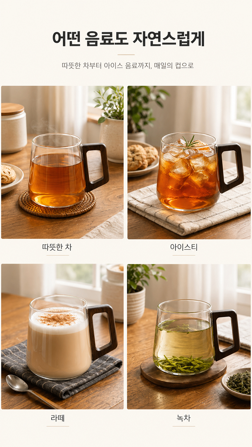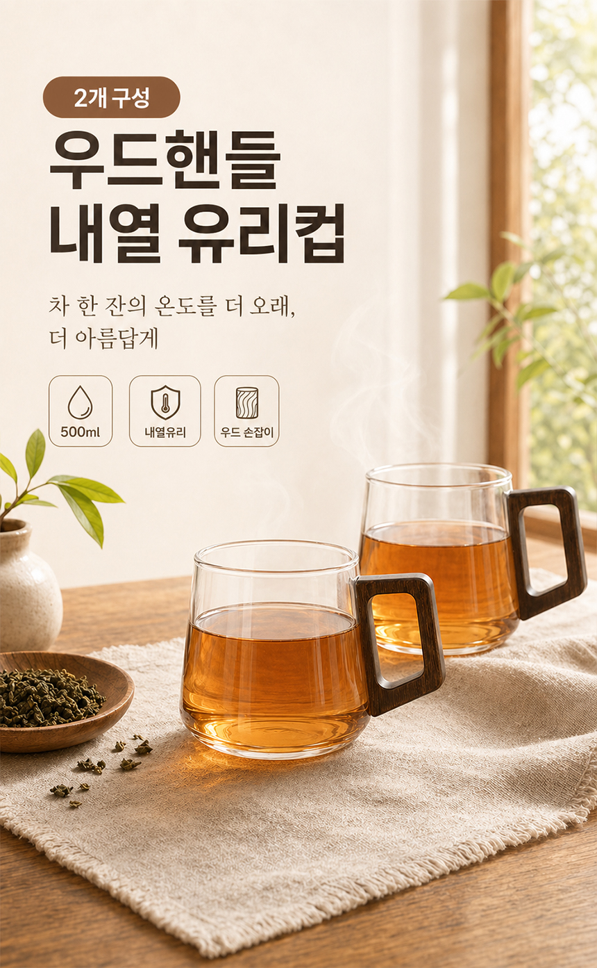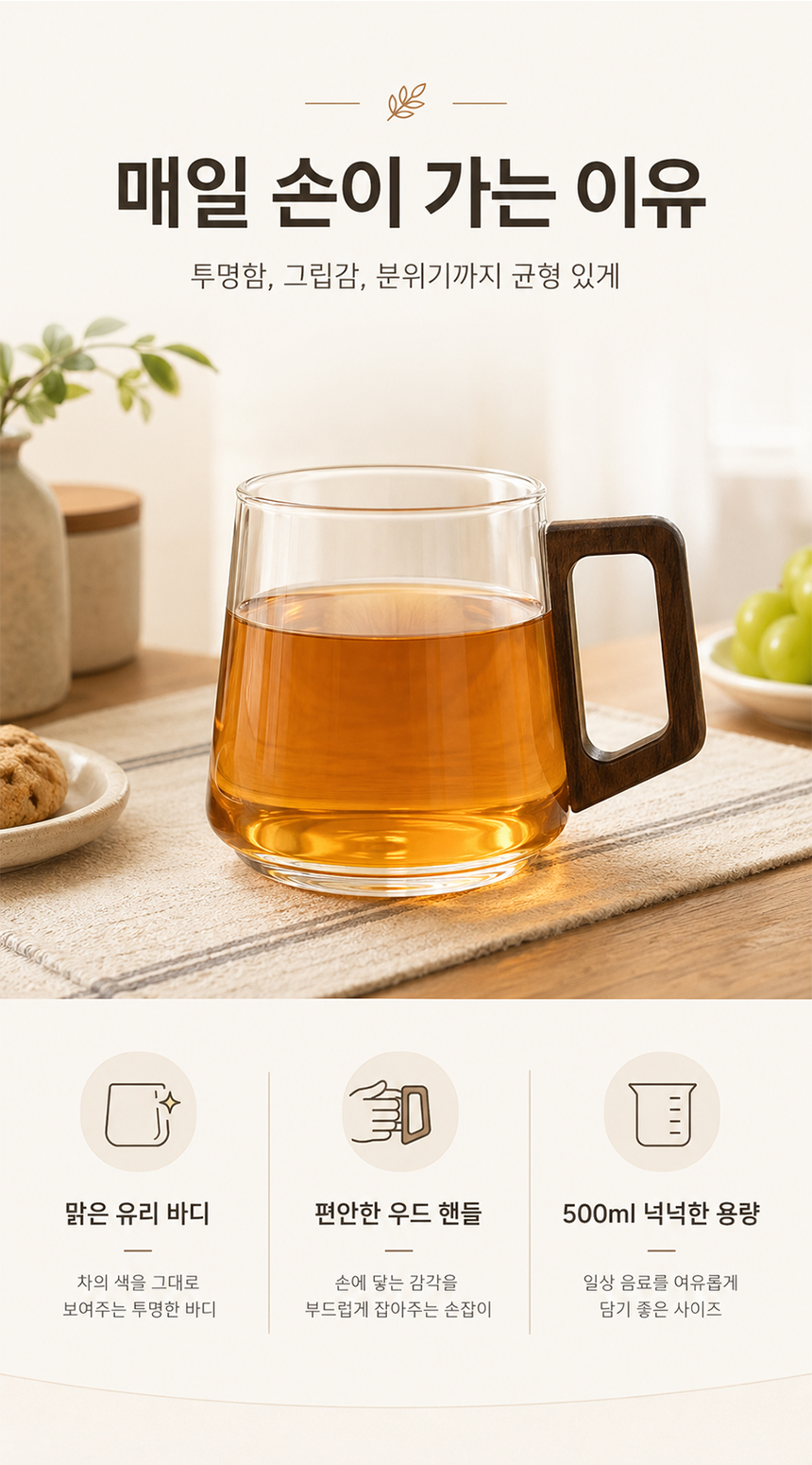우드 핸들 예쁜 둥글 내열 유리컵 머그컵 2p 500ml