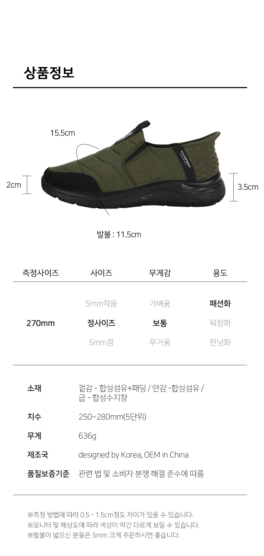 | 제품군 | 구두/신발 | 제품의 주소재 | Upper[겉감]: 합성섬유+패딩/ Lining[안감] : 합성섬유 / Out sole : 합성수지창 |