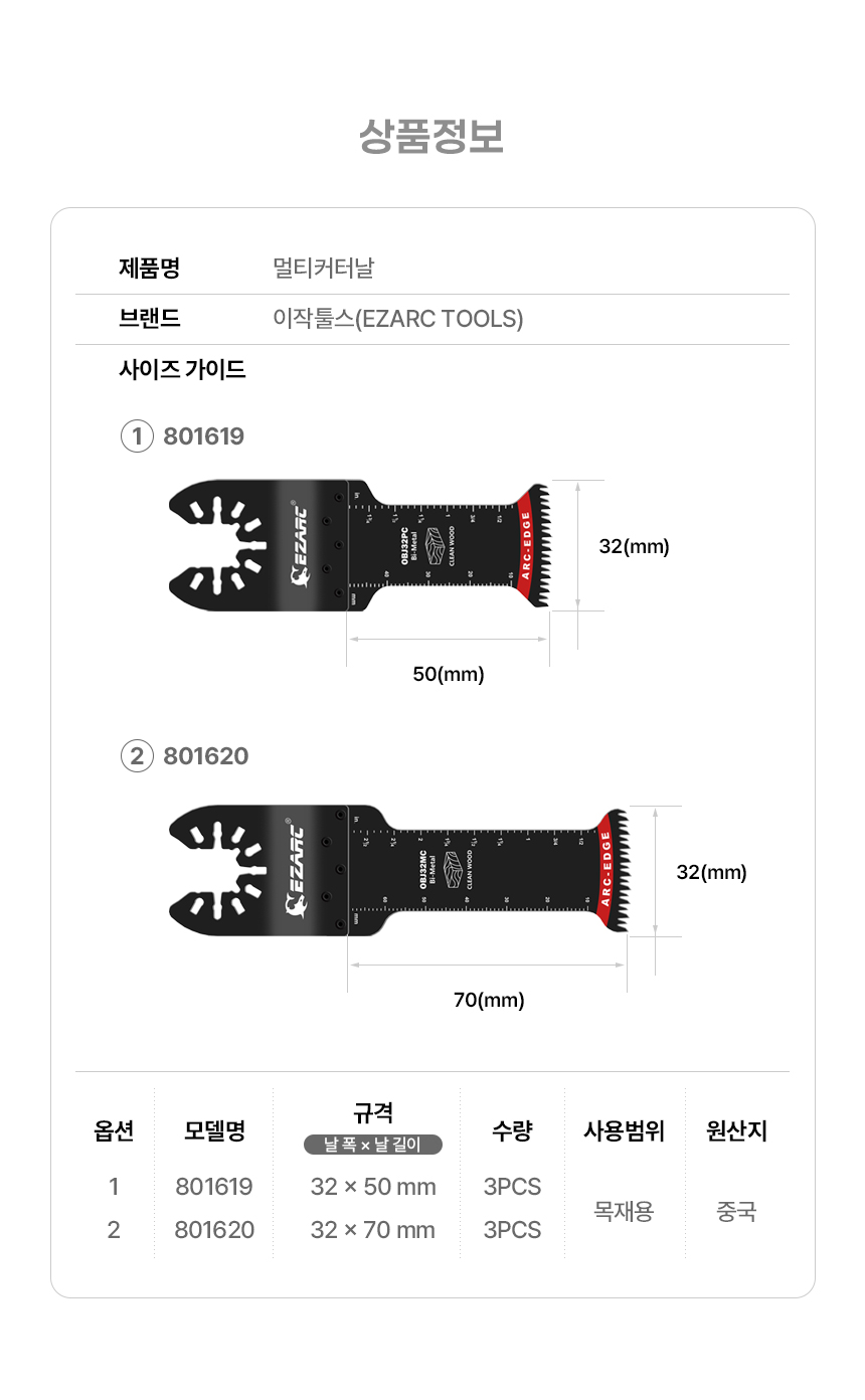 제품군 기타재화 품명 EZAC TOOLS 목재용 멀티커터날 32X50MM 3PCS