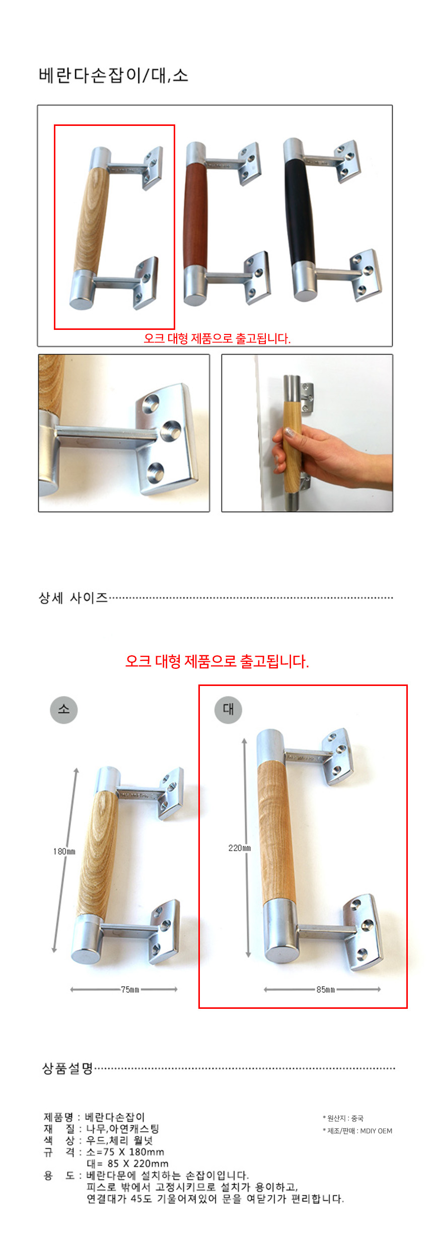 베란다문 손잡이 오크 대형 85x220mm