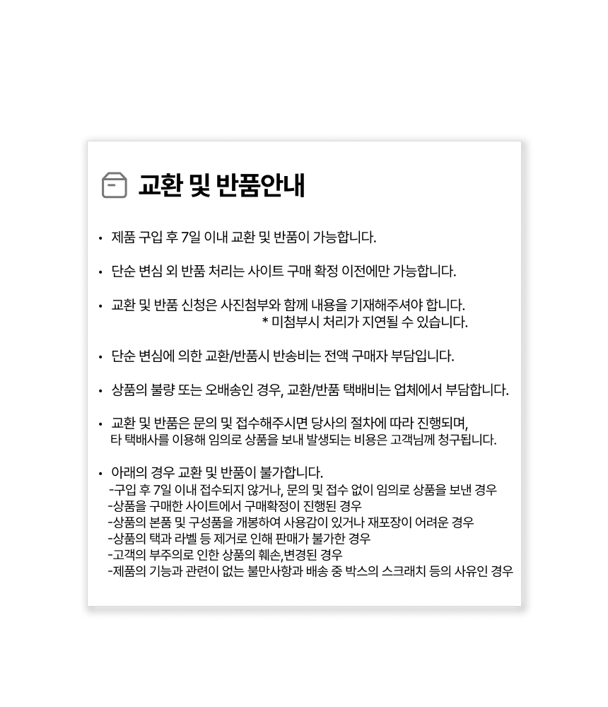 ※ 오배송, 불량, 파손 이외의 사유 및 색상 차이에 의한 반품/교환은 변심에 해당됩니다.
