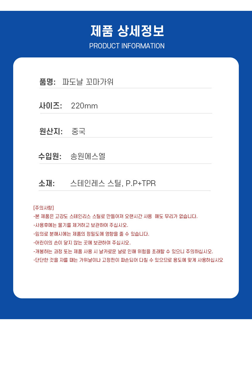 | 제품군 | 주방용품 | 품명 | 품명:파도날 꼬마가위 220mm |