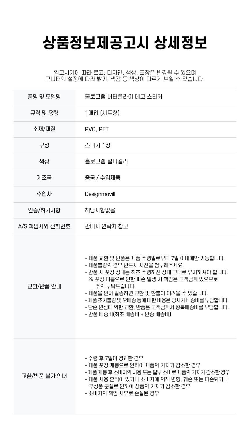 | 제품군 | 기타재화 | 품명 | 홀로그램 나비 스티커 |