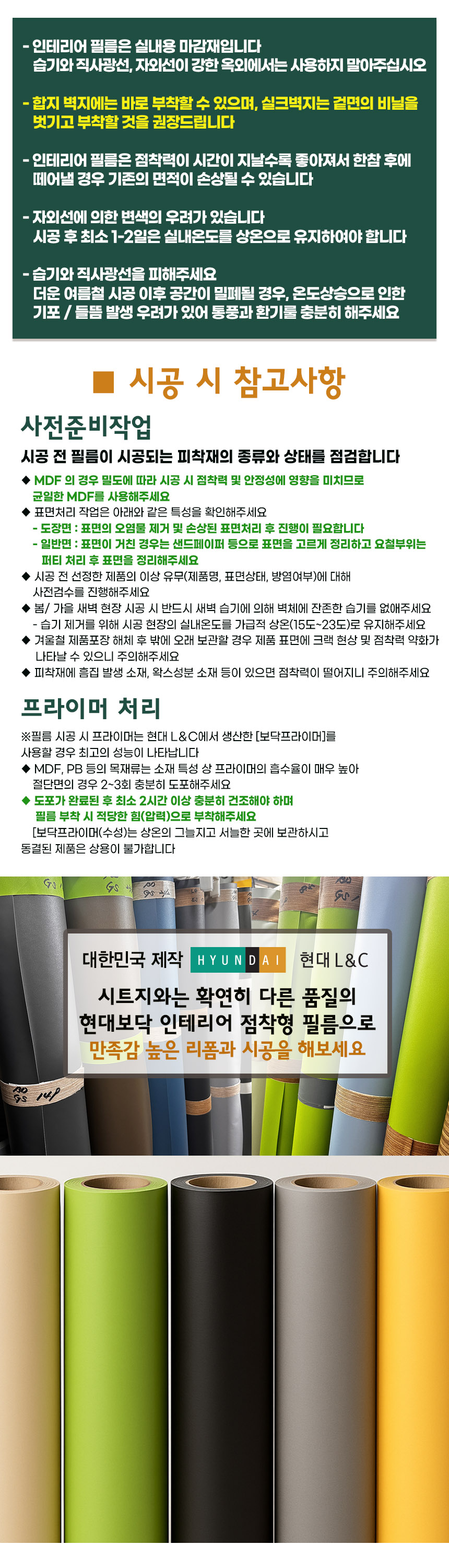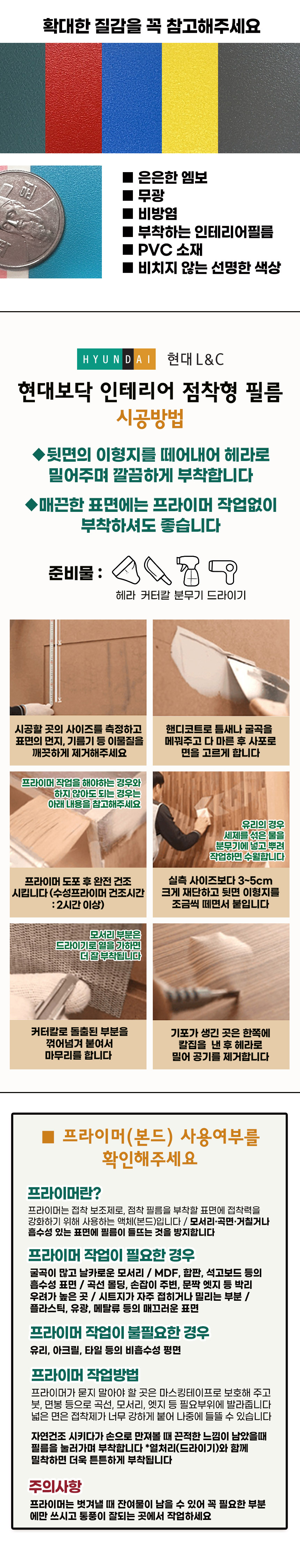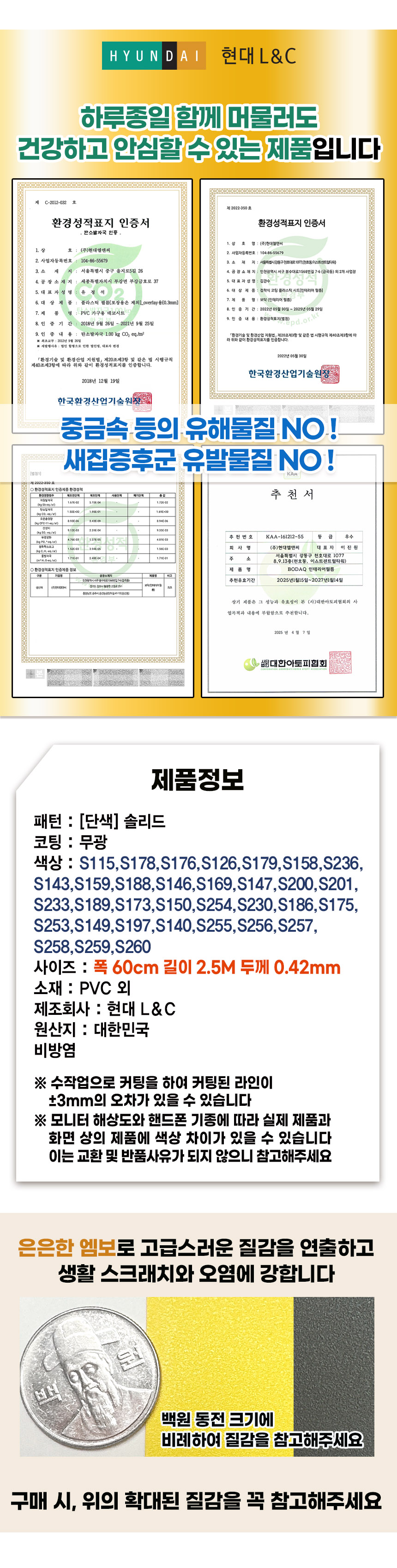 | 모델명 | 국산 현대보닥 점착형인테리어필름 솔리드 | 법에 의한 인증, 허가 등을 받았음을 확인할 수 있는 경우 그에 대한 사항 | 상세페이지 참고 |