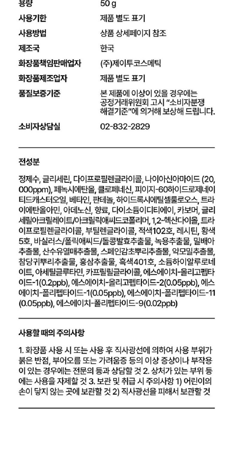 | 사용방법 | 상세정보 별도표기 | 화장품제조업자 | (주)제이투코스메틱 |