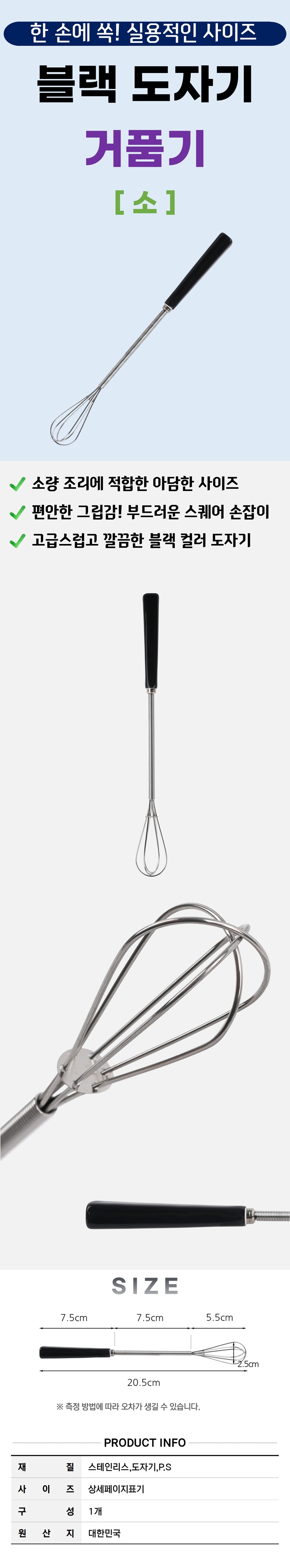 그립감 좋은 사각 손잡이 스텐 거품기-블랙 소형 20.5cm