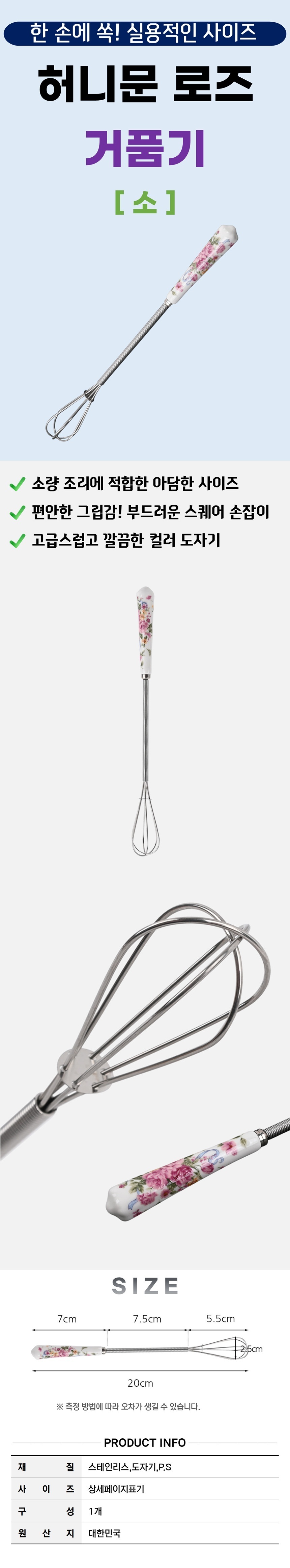 그립감 좋은 사각 손잡이 스텐 거품기-로즈 소형 20.5cm