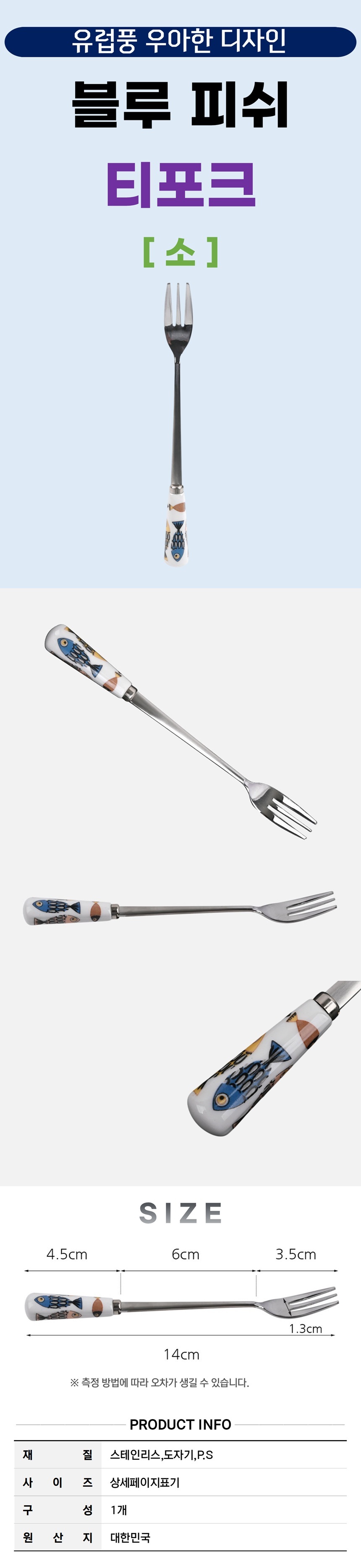 유럽풍 블루피쉬 도자기핸들 스텐 티포크-소 케이크 과일 찍어 먹는 포크