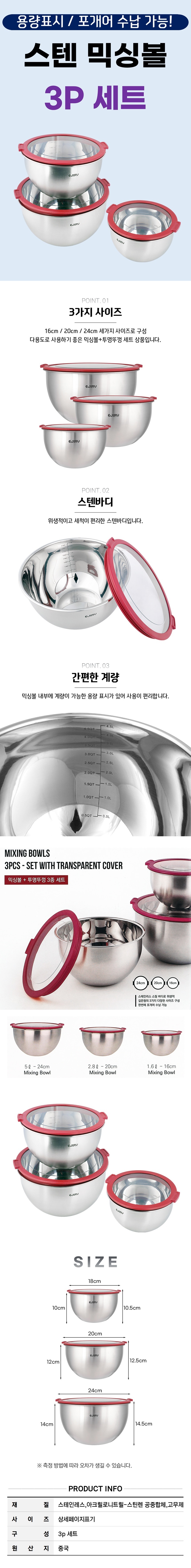 뚜껑 있는 스텐 믹싱볼 3종 세트 눈금 계량 샐러드 볼 베이킹 반죽 양푼