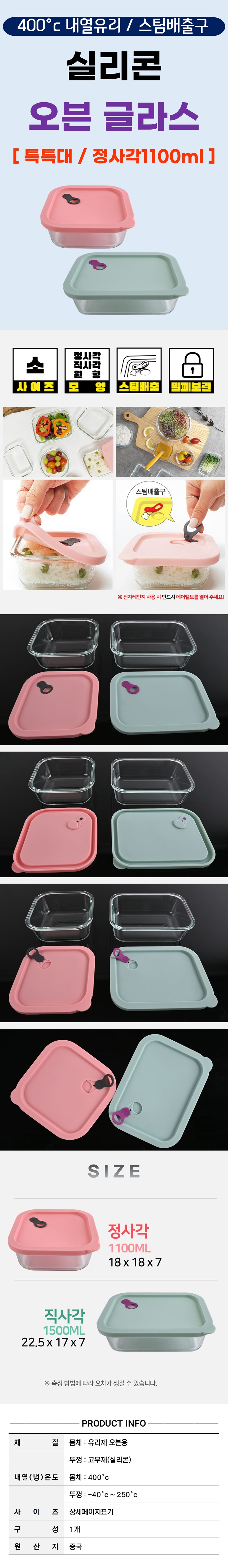 400도 내열 유리 반찬통 (특특대) 정사각1100ml 숨쉬는 에어홀 뚜껑 스팀홀