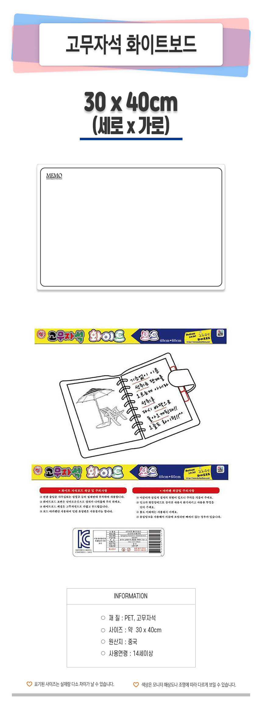 | 모델명 | 고무자석 화이트보드 30x40 | 법에 의한 인증, 허가 등을 받았음을 확인할 수 있는 경우 그에 대한 사항 | 상세페이지 참조 |