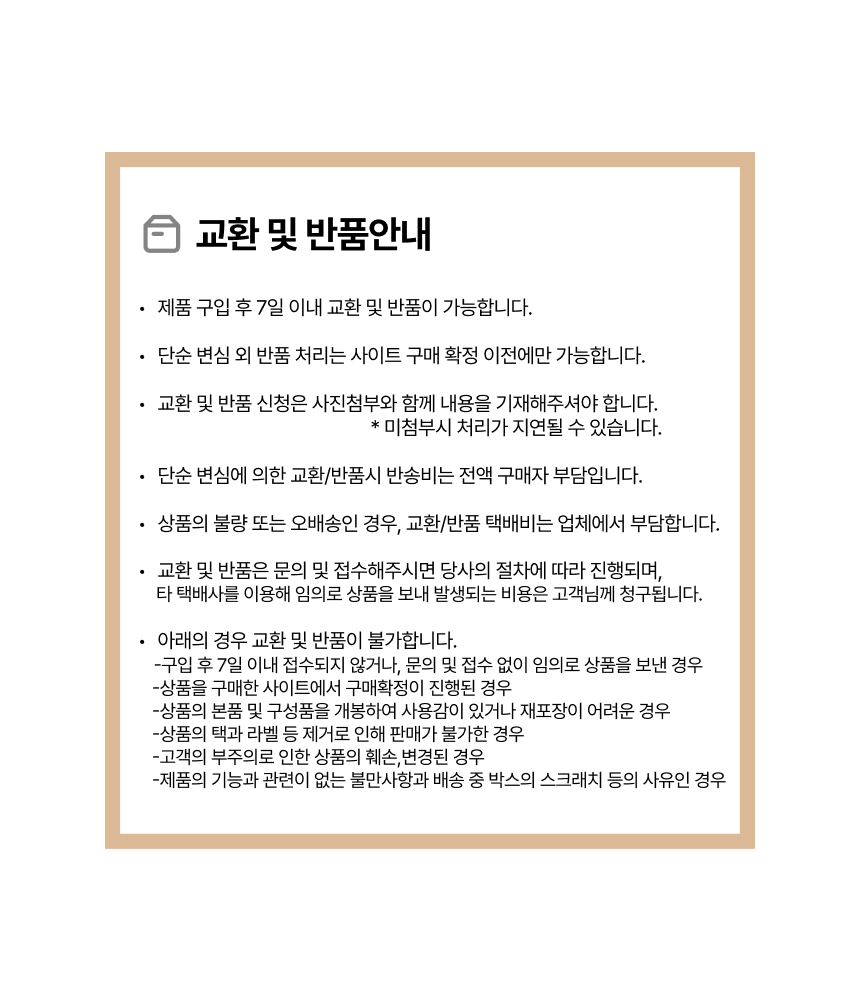 본 제품을 구매하시면 원활한 배송을 위해 꼭 필요한 고객님의 개인정보를 (성함, 주소, 전화번호 등) 택배사 및 제 3업체에서 이용하는 것에 동의하시는 것으로 간주됩니다.