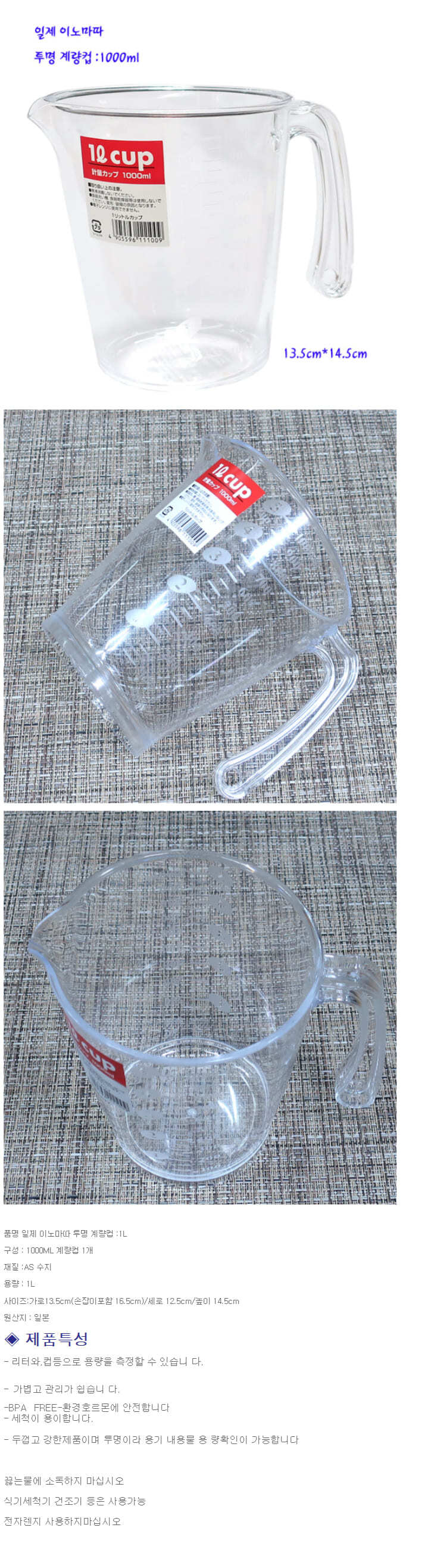 이노마따 계량컵 비커 라면물 베이킹 이유식 투명 용량컵 1L