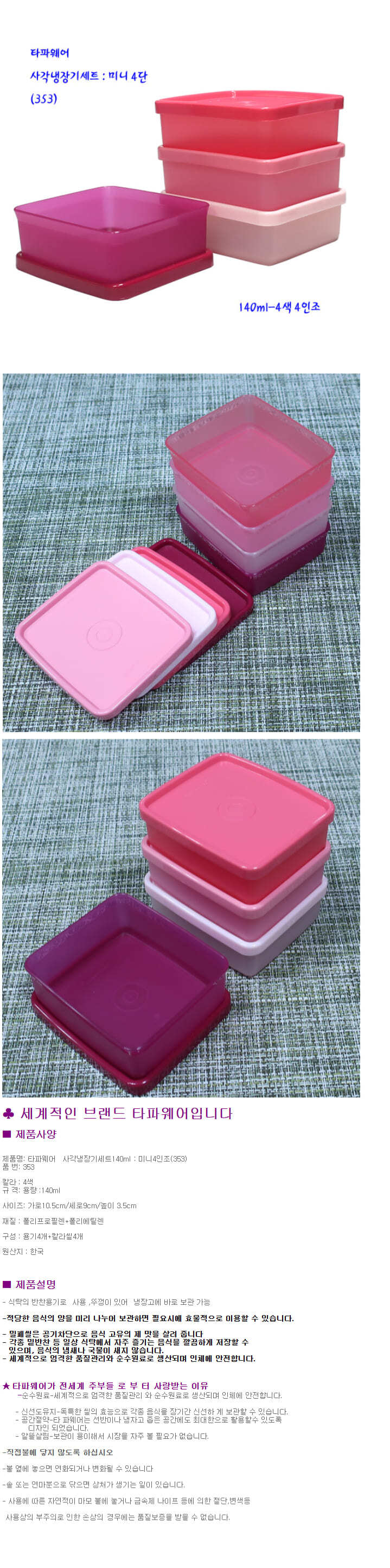 타파웨어 사각 반찬통 냉장고 보관 밀폐 용기 미니 찬통 140ml 4p
