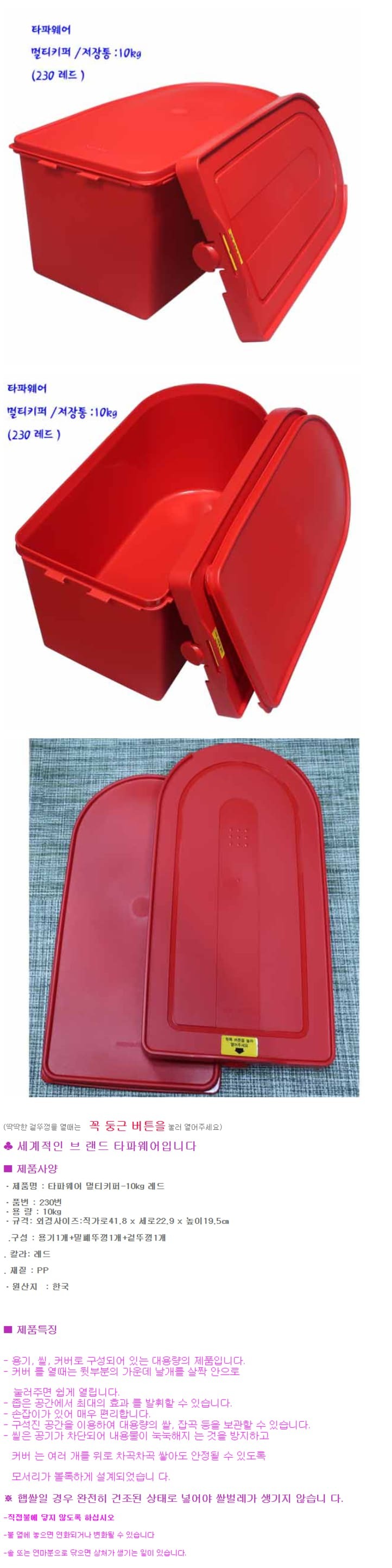 타파웨어 쌀통 밀폐용기 잡곡통 쌀보관 밀폐 용기 레드 10kg