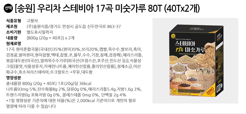 송원 우리차 스테비아 17곡 미숫가루 80T (40Tx2개)