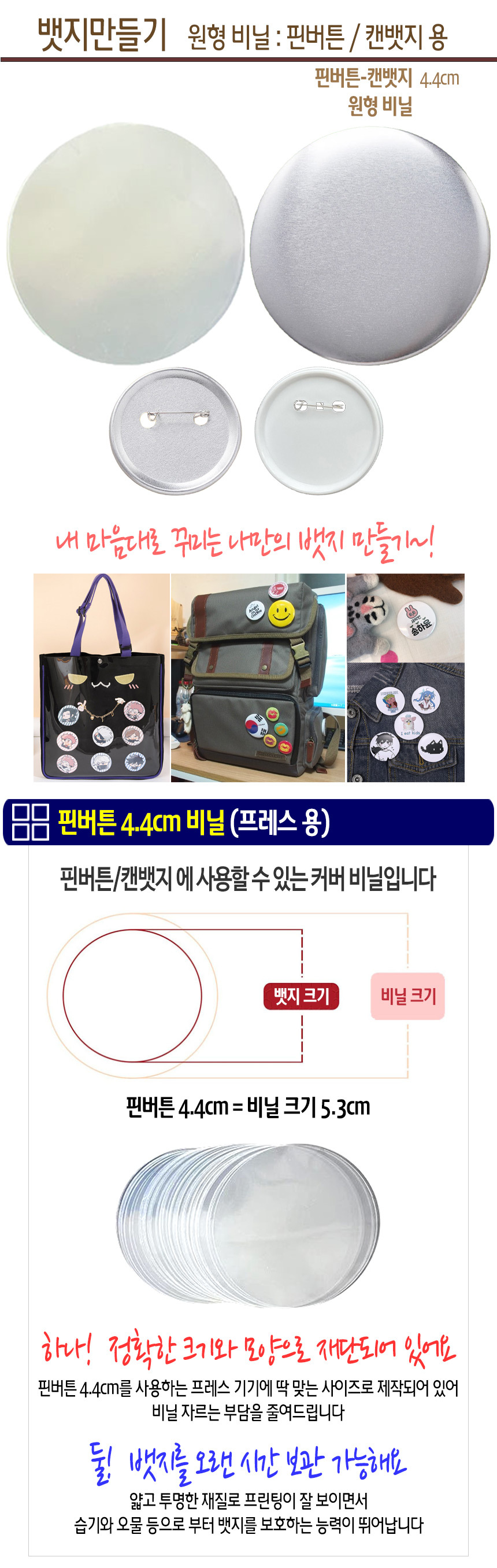 핀버튼 비닐 44mm (100장) 커버 필름 원형 커팅 핀뱃지 캔뱃지 뱃지 만들기 재료