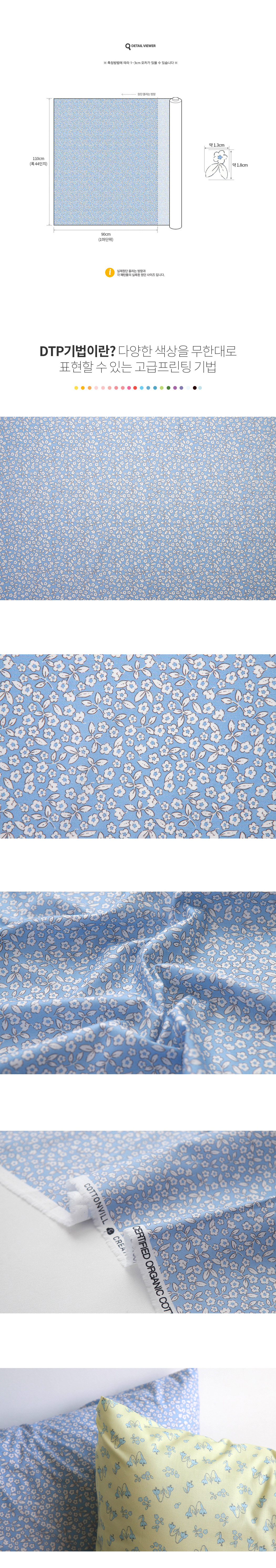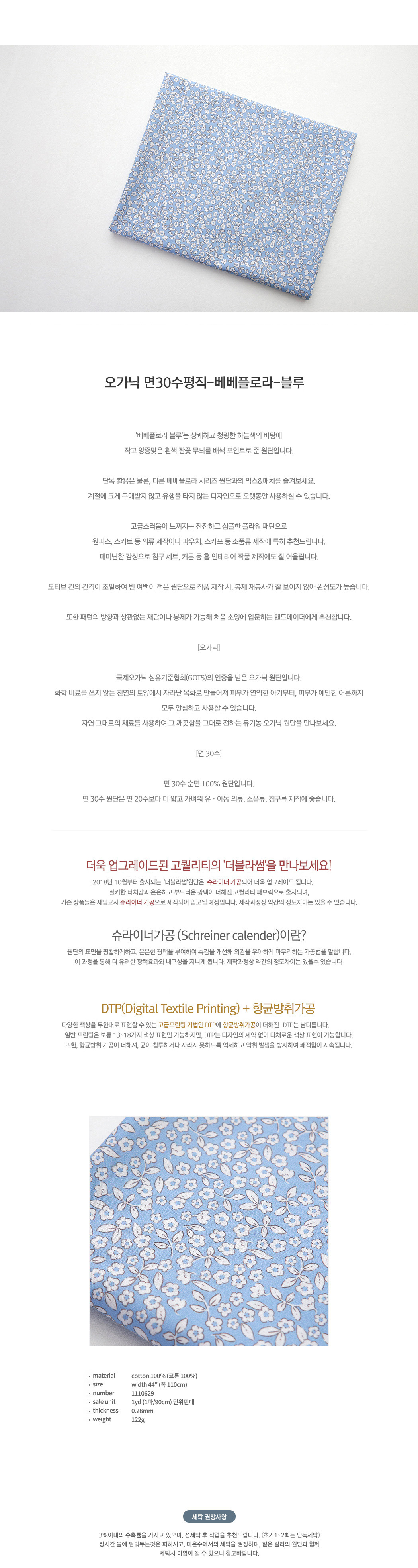 오가닉 원단 면 30수 가로110cm X 세로90cm 블루