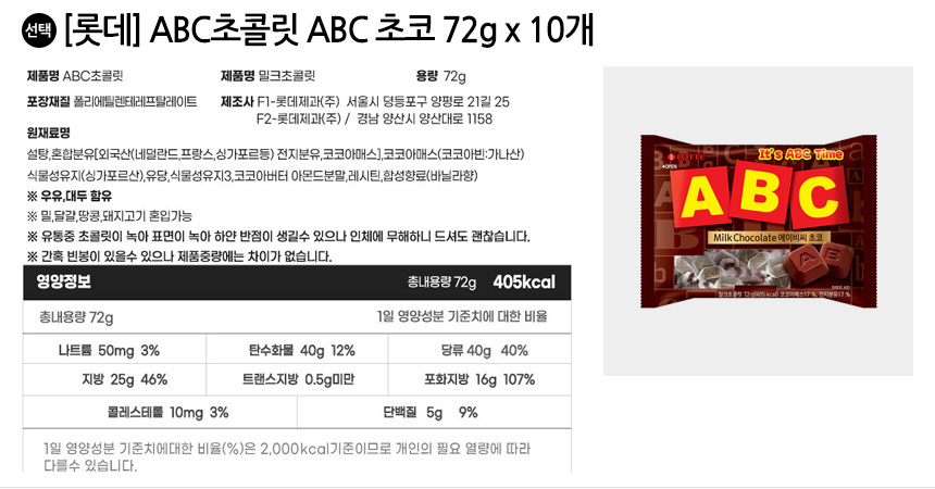롯데 ABC초콜릿 ABC 초코 72g x 10개