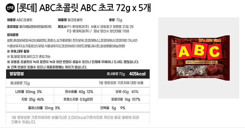 롯데 ABC초콜릿 ABC 초코 72g x 5개
