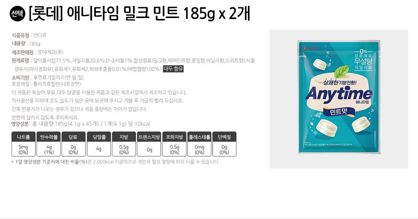 롯데 애니타임 밀크 민트 185g x 2개