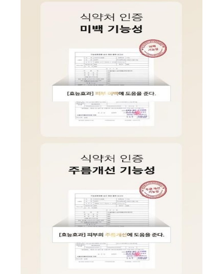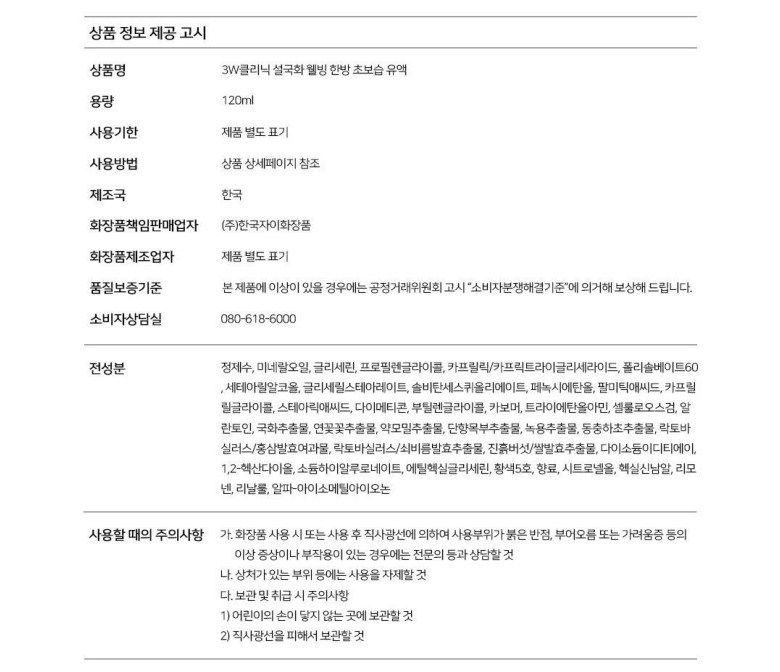 | 「화장품법」에 따른 기능성 화장품(미백, 주름개선, 자외선 차단제품 등)의 경우 | 상세정보 별도표기 | 사용할 때의 주의사항 | 상세정보 별도표기 |