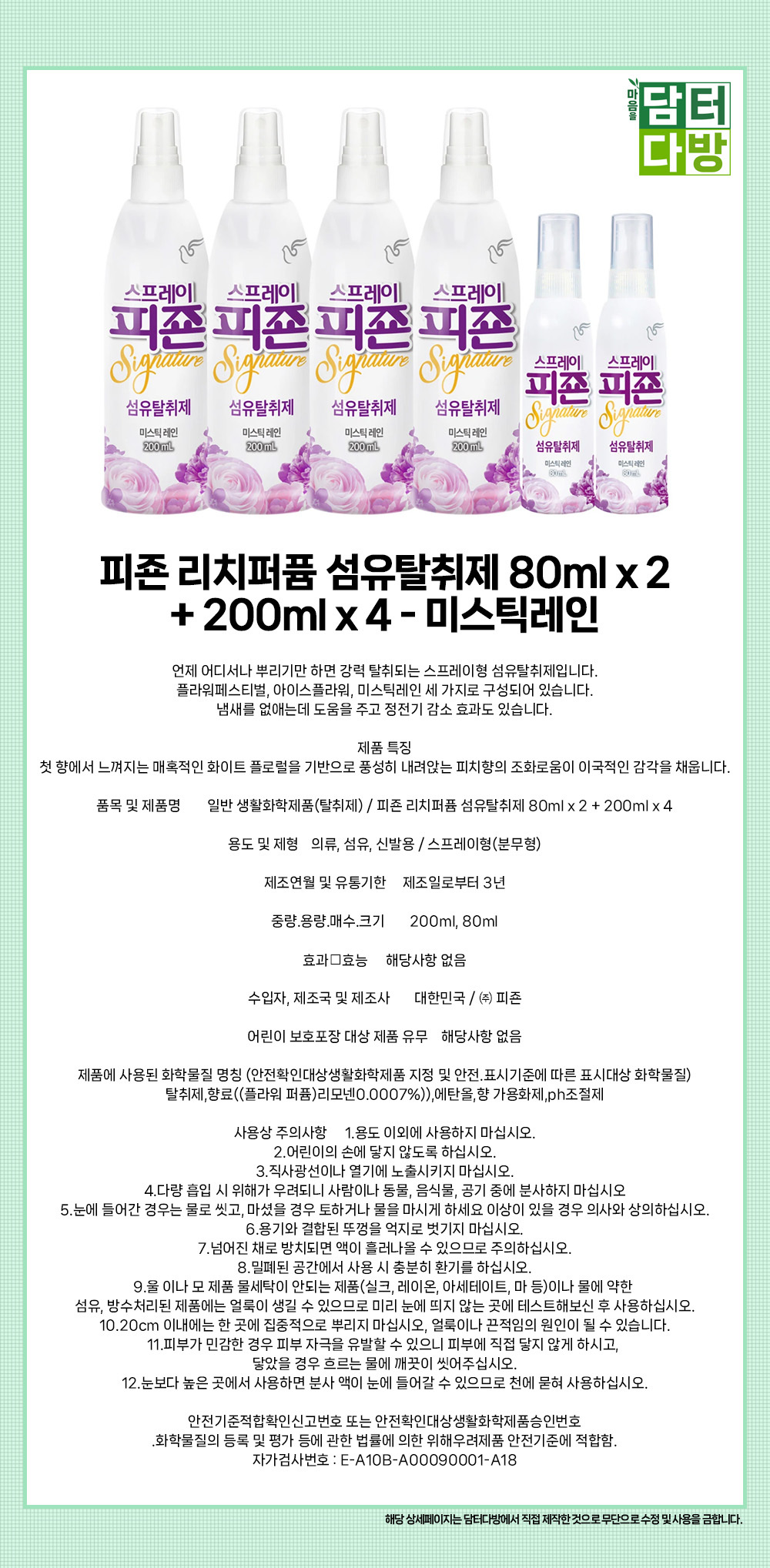 피죤 리치퍼퓸 섬유탈취제 80ml x 2 + 200ml x 4 - 미스틱레인