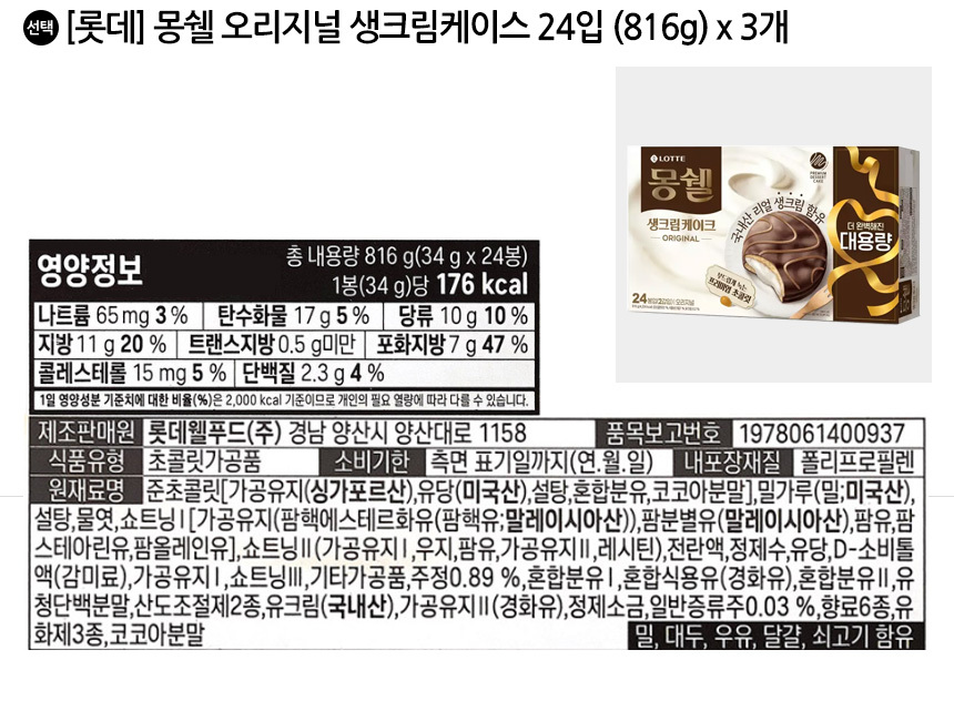 롯데 몽쉘 오리지널 생크림케이스 24입 (816g) x 3개