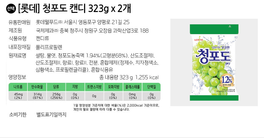 롯데 청포도 캔디 323g x 2개