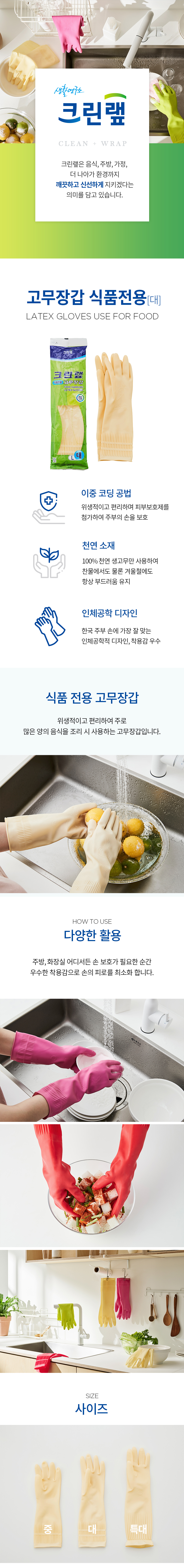 크린랲 식품전용 고무장갑 대형 크린랩 라텍스 글러브 3개입