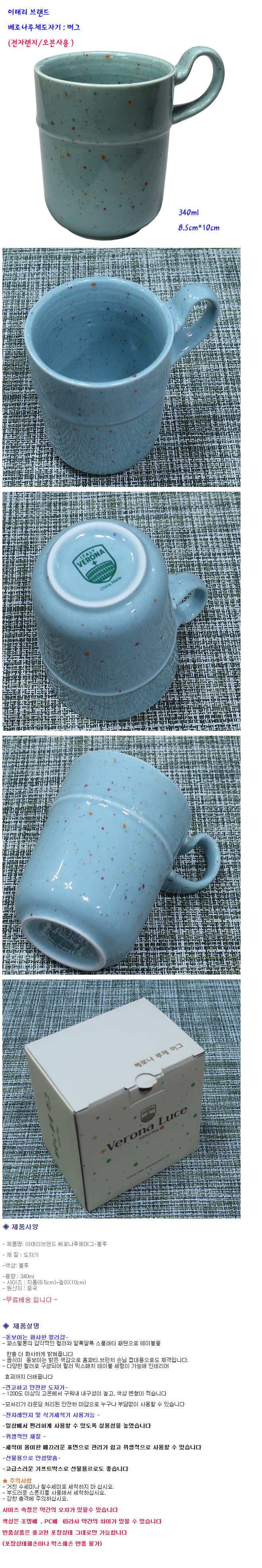 베로나루체 머그컵 가정 카페 커피잔 물컵 머그잔 340ml 블루