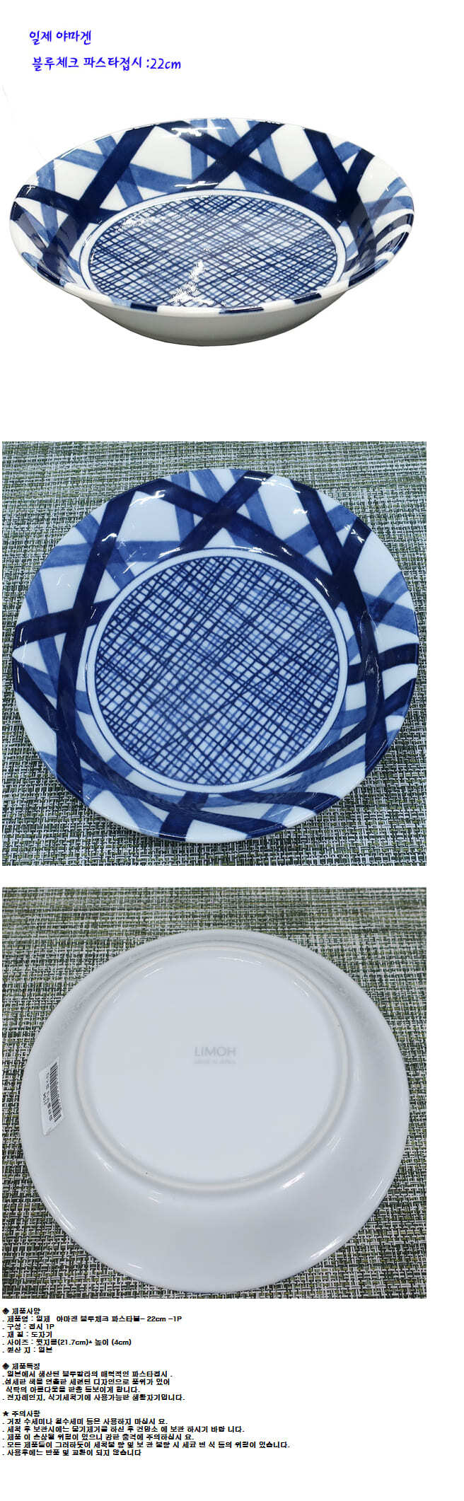 야마겐 파스타볼 브런치 샐러드 그릇 도자기 접시 22cm 블루체크