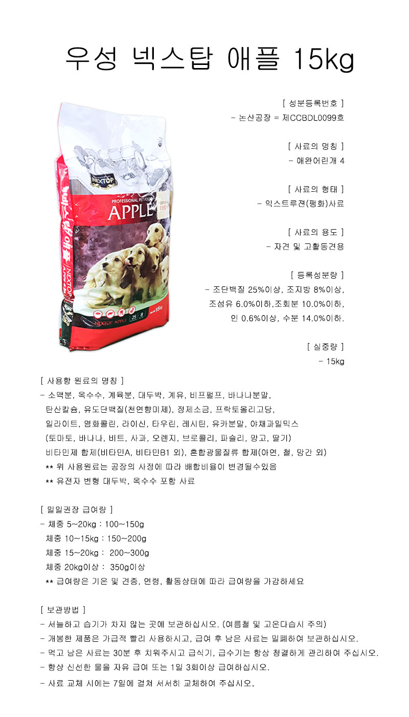 우성 넥스탑 강아지 사료 반려견 동물 에너지 애플 밥 15kg