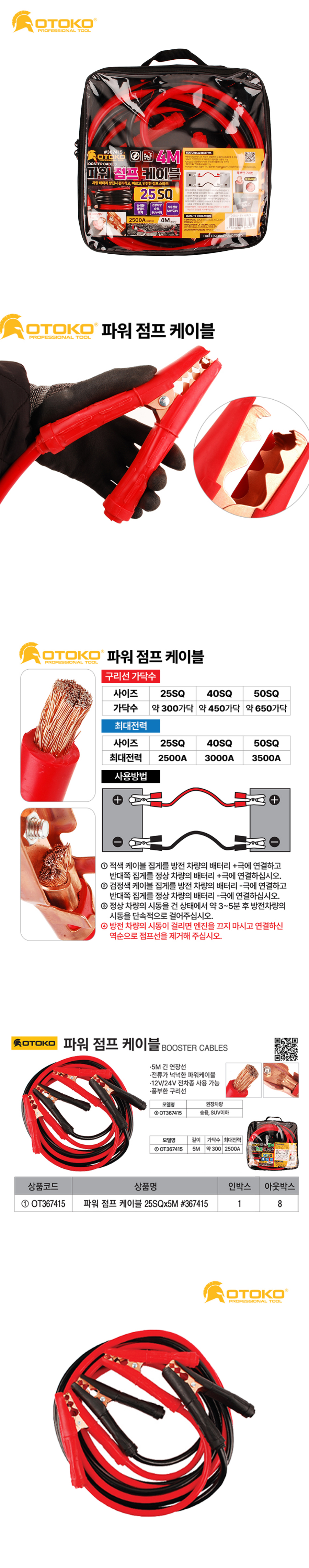 점프선 고용량 접지선 오토바이 스타터 25SQx4M 파워 점프케이블
