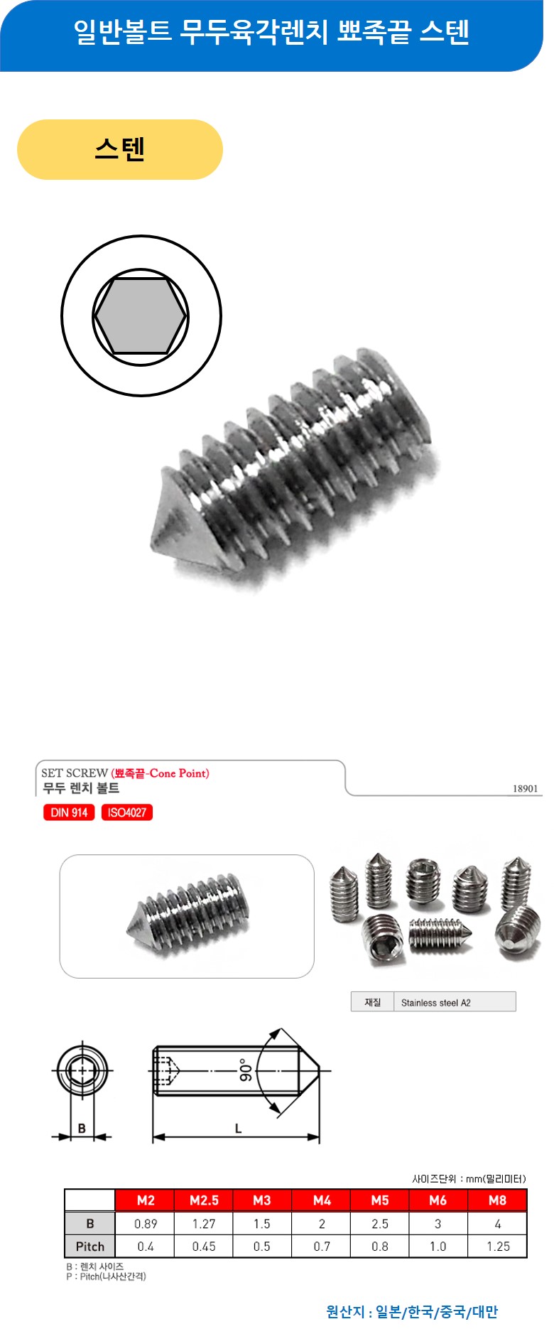 일반볼트 무두육각렌치 스텐 뾰족끝 M5x12mm 200개