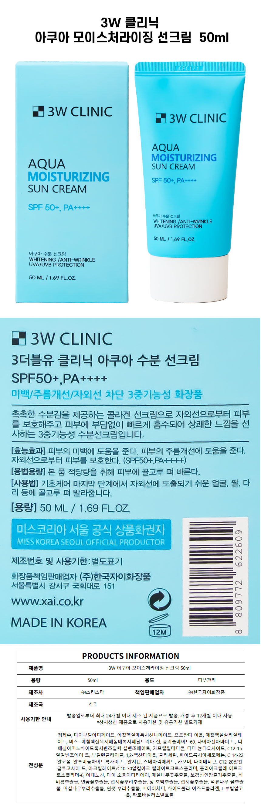 3W 클리닉 아쿠아 모이스처라이징 선크림 50ml