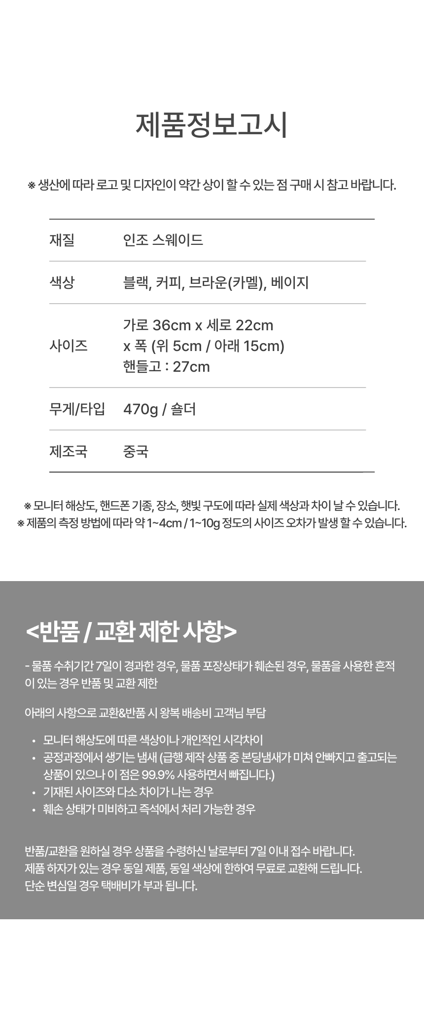 ※ 오배송, 불량, 파손 이외의 사유 및 색상 차이에 의한 반품/교환은 변심에 해당됩니다.