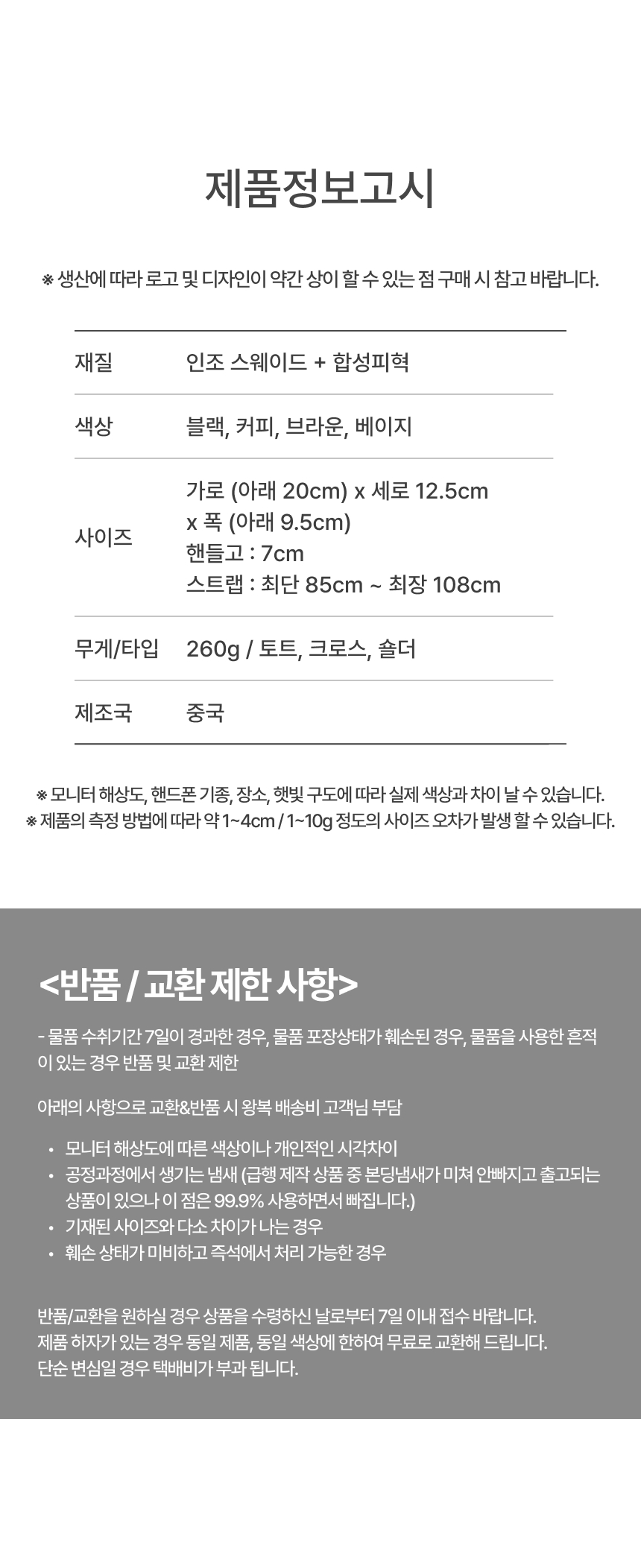 ※ 오배송, 불량, 파손 이외의 사유 및 색상 차이에 의한 반품/교환은 변심에 해당됩니다.