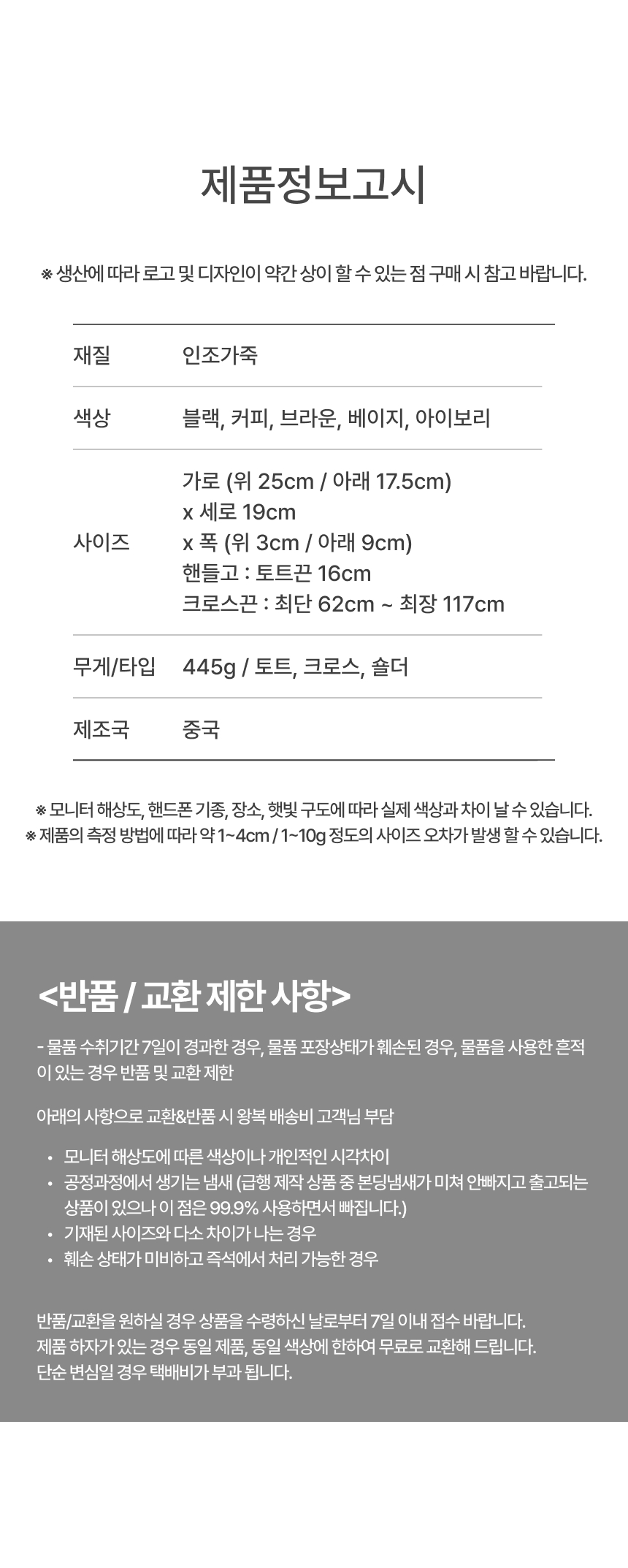 ※ 오배송, 불량, 파손 이외의 사유 및 색상 차이에 의한 반품/교환은 변심에 해당됩니다.