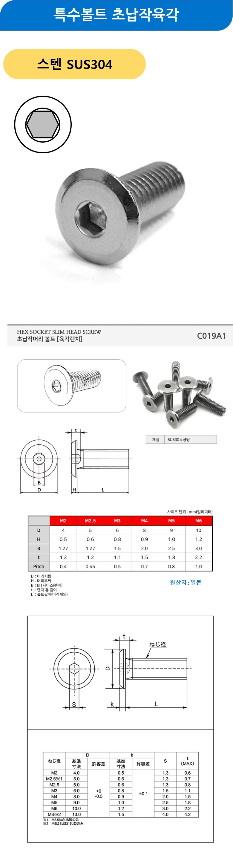 특수볼트 육각납작머리렌치 스텐 M10x80mm 100개