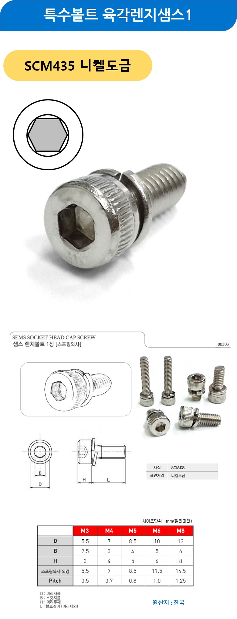특수볼트 육각렌지샘스1 니켈도금 M4x6mm 500개