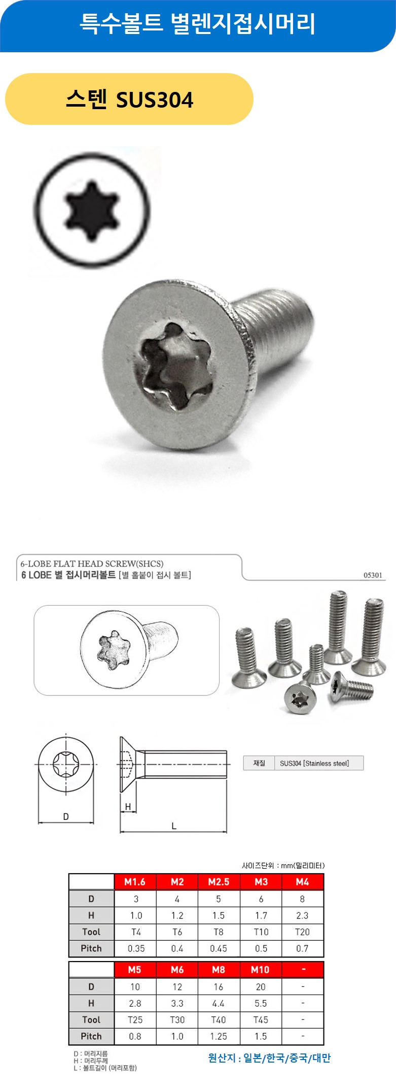 특수볼트 별렌지접시머리 스텐 M1.6x8mm 200개