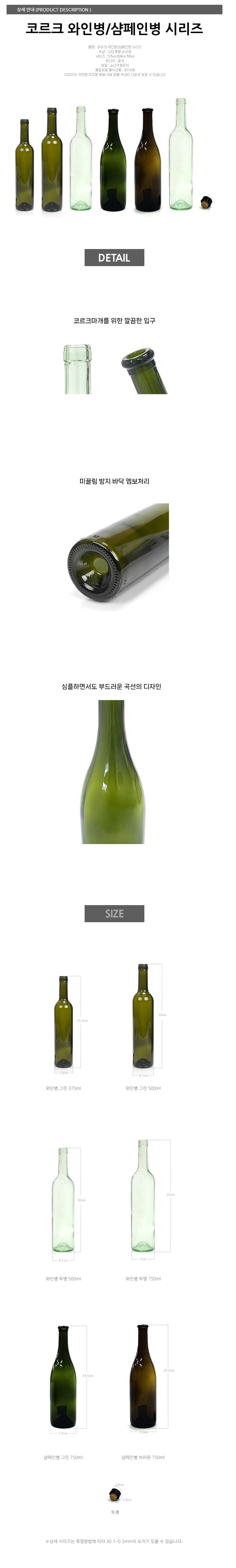 유리 와인병 코르크마개 포함 와인보틀 홈카페 술병 그린 500ml