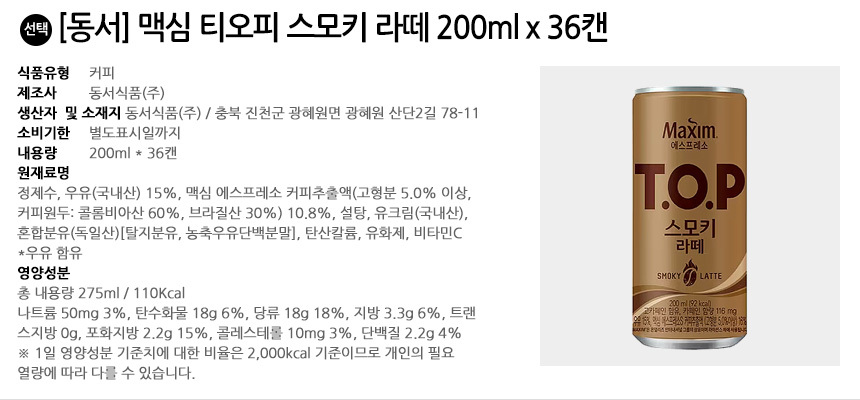맥심 티오피 스모키 라떼 200ml x 36캔