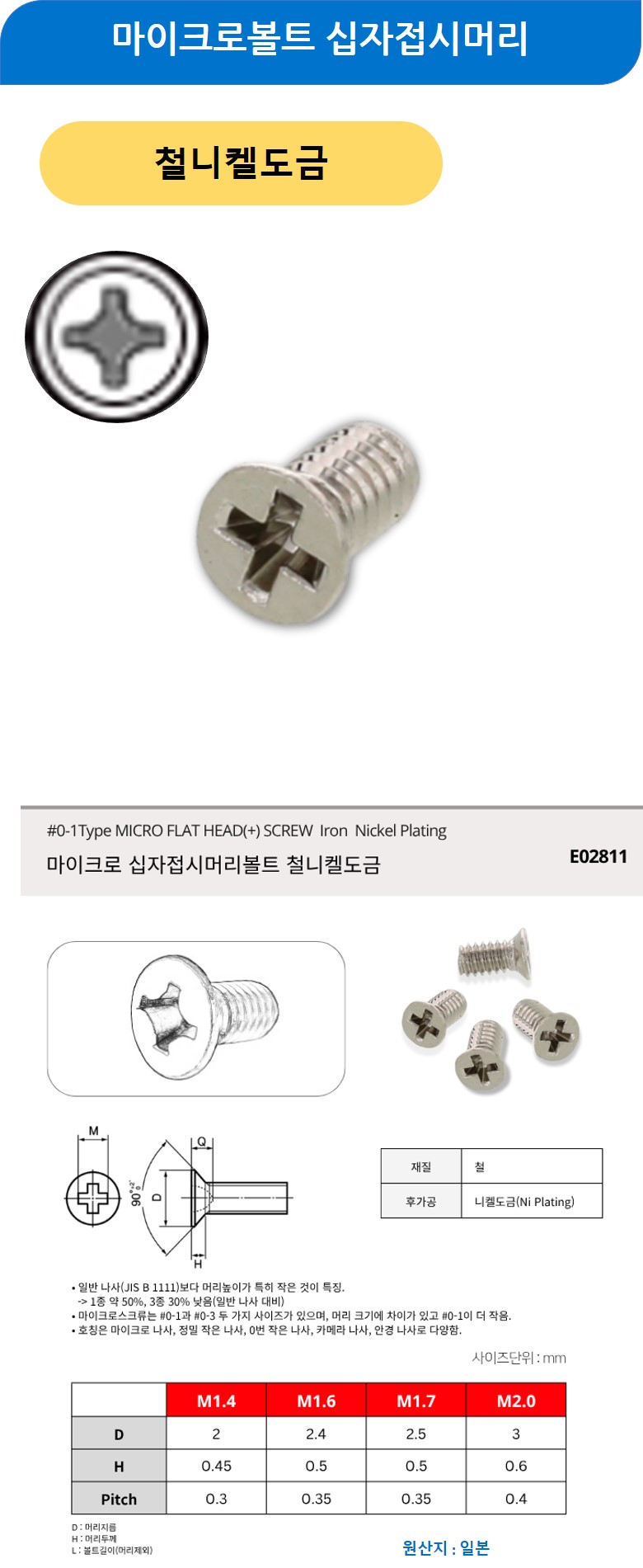 마이크로볼트 십자접시머리 철니켈도금 M1.7x10mm 1000개