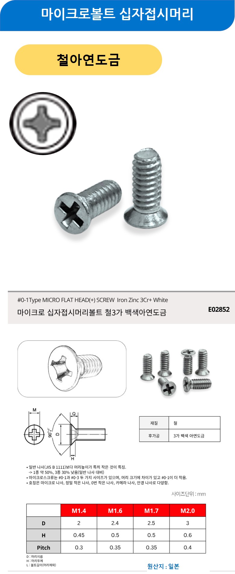 마이크로볼트 십자접시머리 철아연도금 M1.6x4mm 1000개
