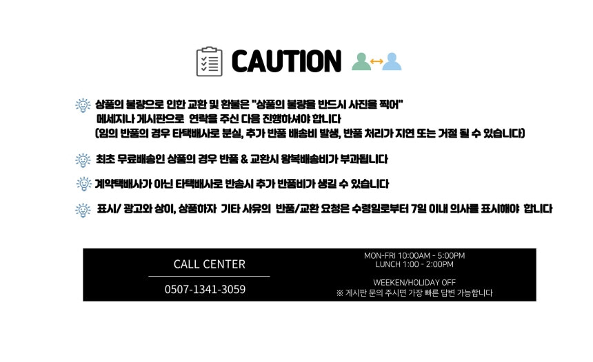 5. 반품지 주소는 1:1문의게시판으로 문의해 주시기 바랍니다.